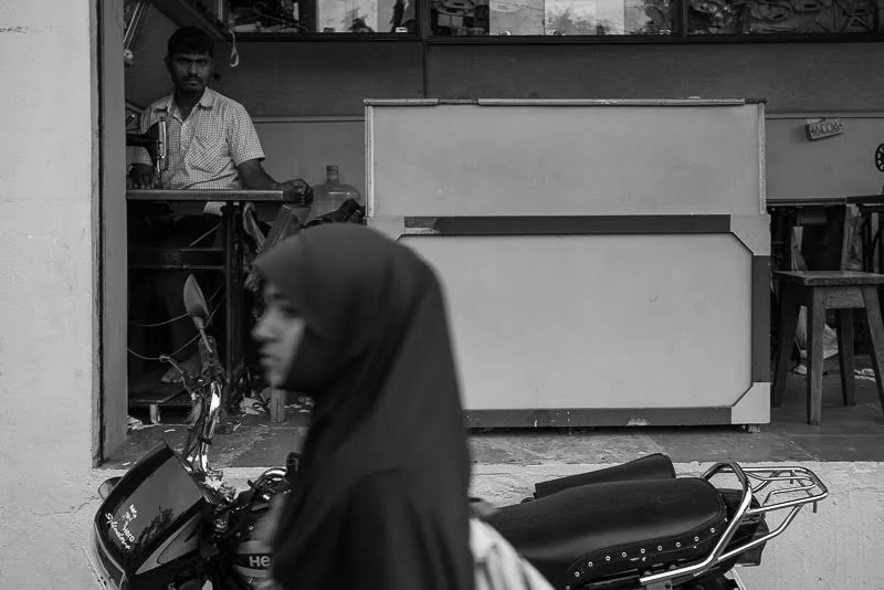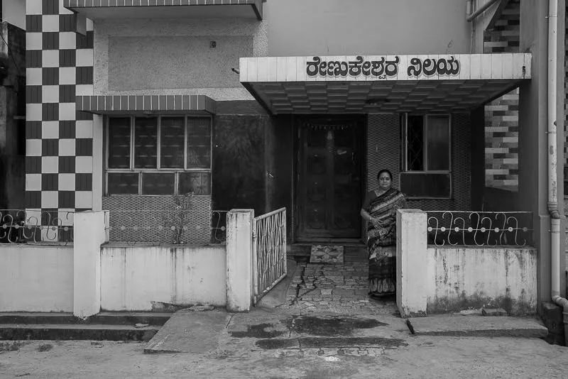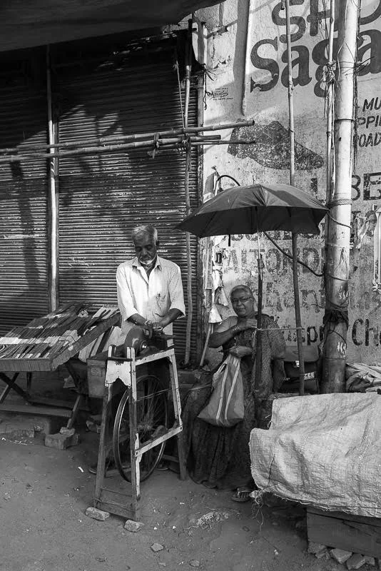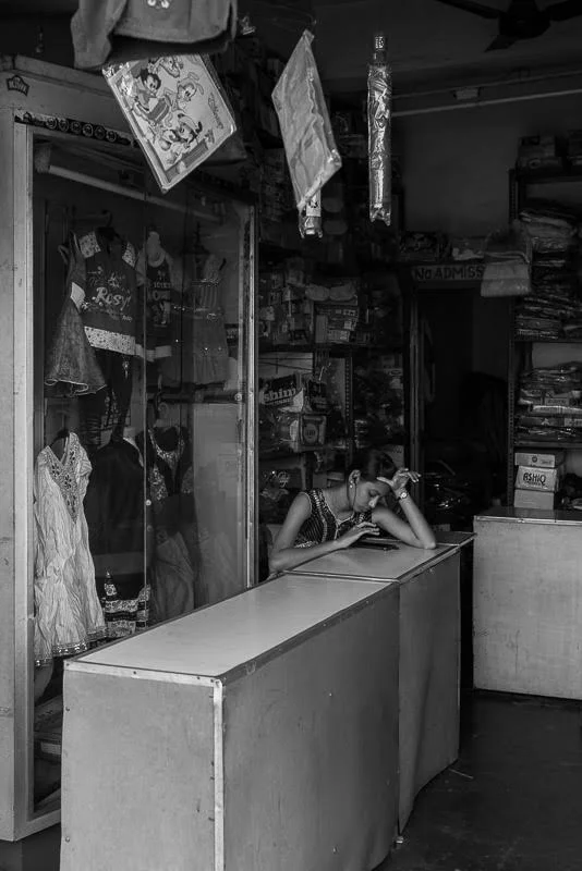 the shopkeeper from Mundgod happy to say Tashi Delek as his assistant dusts the merchandise